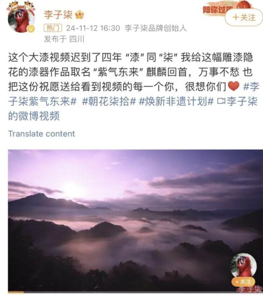 第一条李子柒展示了自己制作一件雕漆隐花漆器作品的过程,寓意吉祥如意。短视频生动地展现了中国漆器的独特美学和工艺之美。