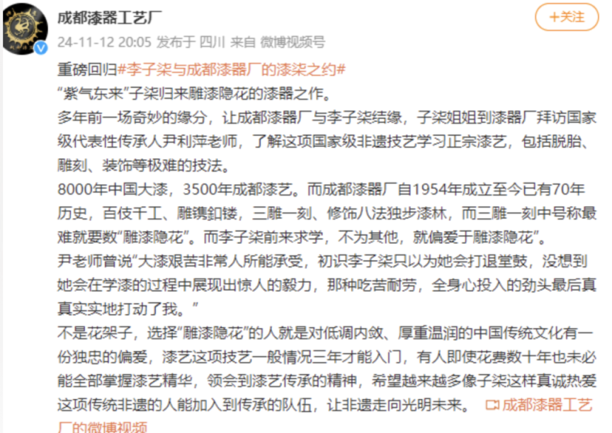 教李子柒制漆工艺的国家级代表性传承人尹利萍老师说:“大漆艰苦非常人所能承受,初识李子柒只以为她会打退堂鼓,没想到她会在学漆的过程中展现出惊人的毅力,那种吃苦耐劳,全身心投入的劲头最后真真实实地打动了我。”