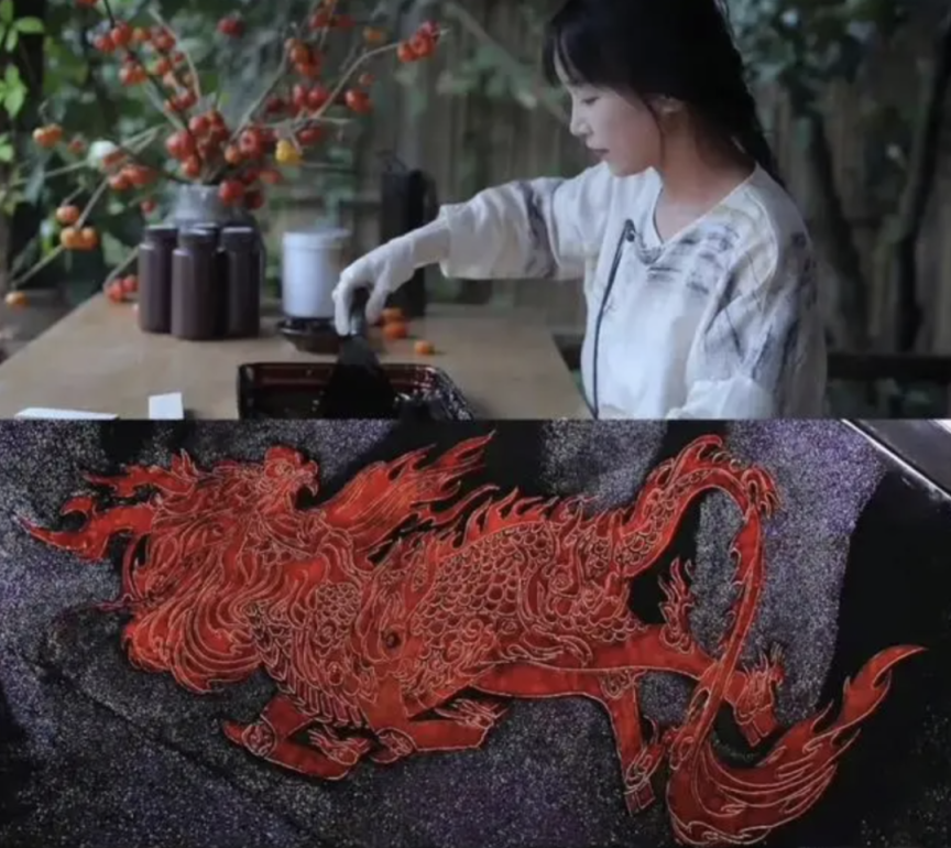 比如,在最新的这条视频里就有四项非遗:缫丝、植物染、蜀锦、绒花。而昨天复更后的第一条视频“雕漆隐花”,创作过程长达半年,背后还有一段不为人知的故事。